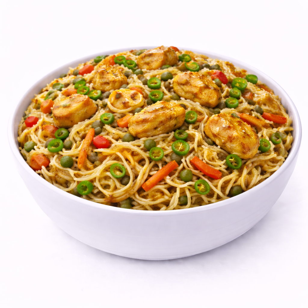 Stir-fried noodles with chicken, vegetables, sauces, and aromatic spices.