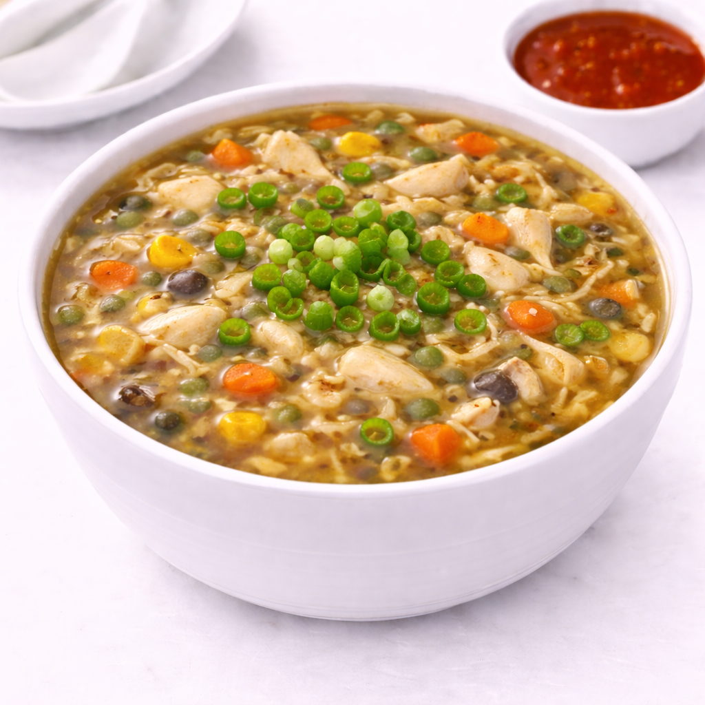 Warm and comforting chicken soup with tender chicken, carrots, and herbs in a flavourful broth.