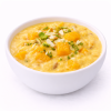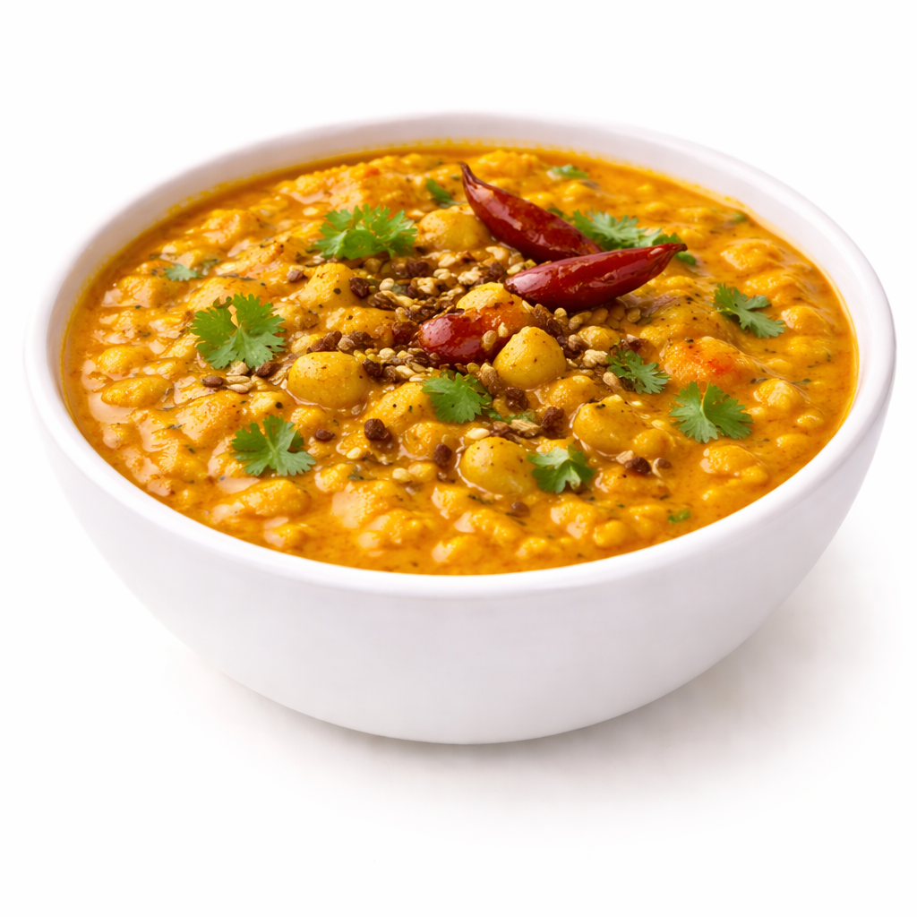 Lentils cooked with turmeric, topped with sautéed onions, tomatoes, and spices, simmered and garnished with coriander.